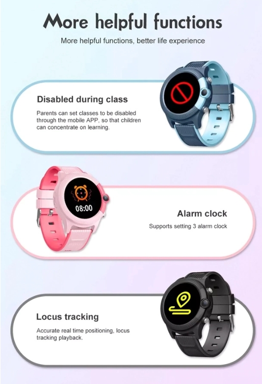 Others: Vibration,No disturbing time, SMS alerts(Low battery alert/SOS alert), Remote shutdown, Alarm clock, Watch finder, Math game, Class schedule,Camera,Calculator,Rewards,Stopwatch, etc.